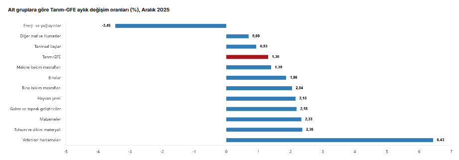 Türkiye İstatistik Kurumu’nun (TÜİK) verilerine göre, Tarım-GFE'de (2020=100), 2025 yılı Aralık ayında bir önceki aya göre yüzde 1,30 artış, bir önceki yılın Aralık ayına göre yüzde 33,15 artış, bir önceki yılın aynı ayına göre yüzde 33,15 artış ve on iki aylık ortalamalara göre yüzde 32,50 artış gerçekleşti.